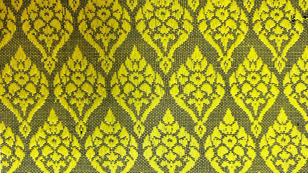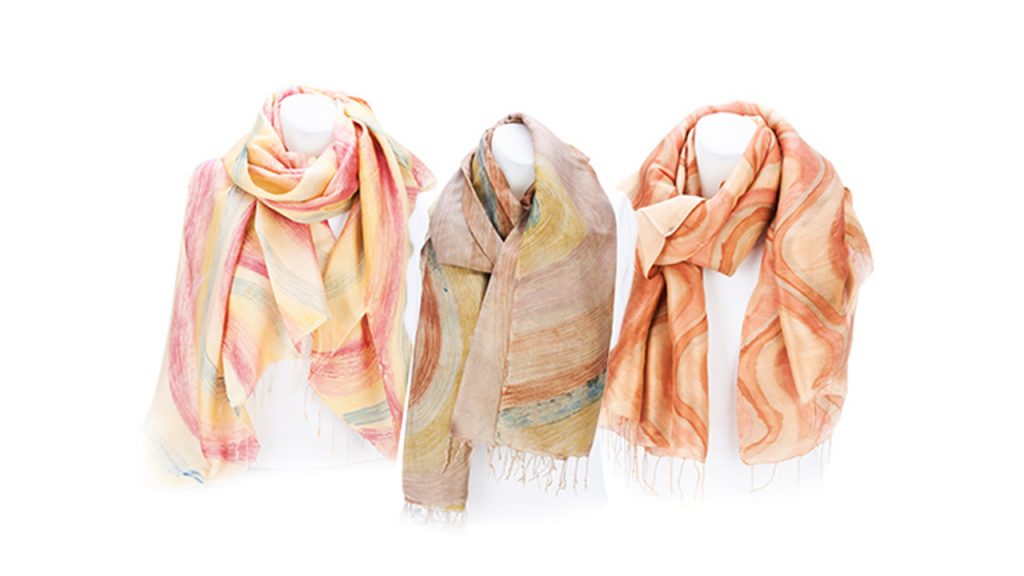 地元で生産された金色の絹糸を使って芸術的に染め上げた製品です。